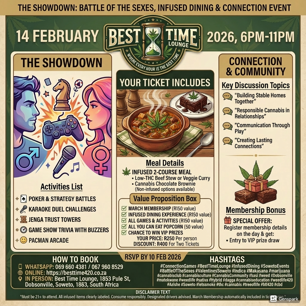 #BestTimeLounge #StrainSpotlight #Soweto #Dobsonville #Indica #ChillVibes #Sativa #CannabisCommunity #SowetoNights #BlueFire #Hybrid #BoardGames #Painting #BalancedVibes